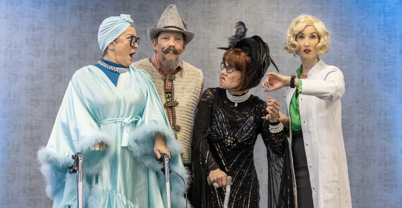 Das Ensemble des Krimi-Dinners (angeführt von Ulrike Pinhammer, 1. von links, als Beatrix und Barbara Bunny sowie André Nessel als Hausdiener Johann, Inga Schlimme als Gräfin Rieselkalk und Ann-Kathrin Forst als Dr. Victoria Sachsenstein)
